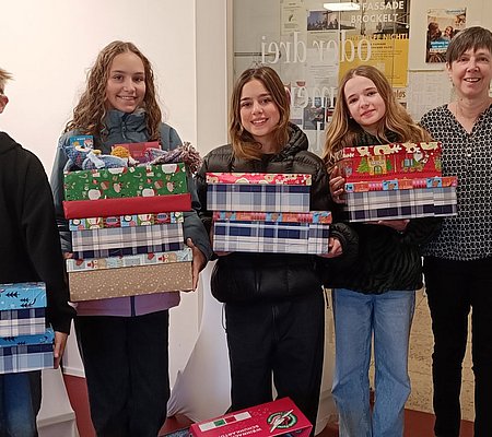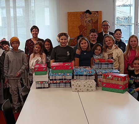 Ebenso bedanken wir uns herzlich bei Renate Egger und der Evangelischen Gemeinde in Kufstein für die Schuhkartons, die uns zur Verfügung gestellt wurden, sowie bei Jonas (7B), Maya, Valentina und Amelie (8A) für die Unterstützung, um die Schuhkartons abzuholen.